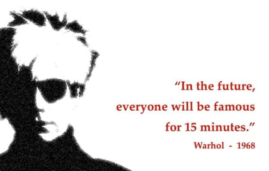 Andy Warhol is commonly attributed with saying that ‘In the future, everyone will be world-famous for 15 minutes’.